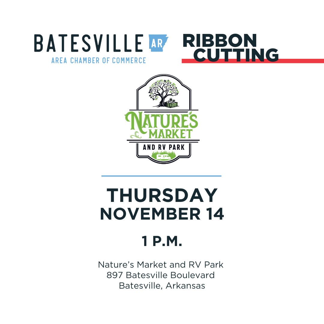 The Batesville Area Chamber of Commerce will host a ribbon-cutting ceremony for Nature’s Market and RV Park on Thursday, November 14, at 1 p.m. at 897 Batesville Boulevard in Batesville.