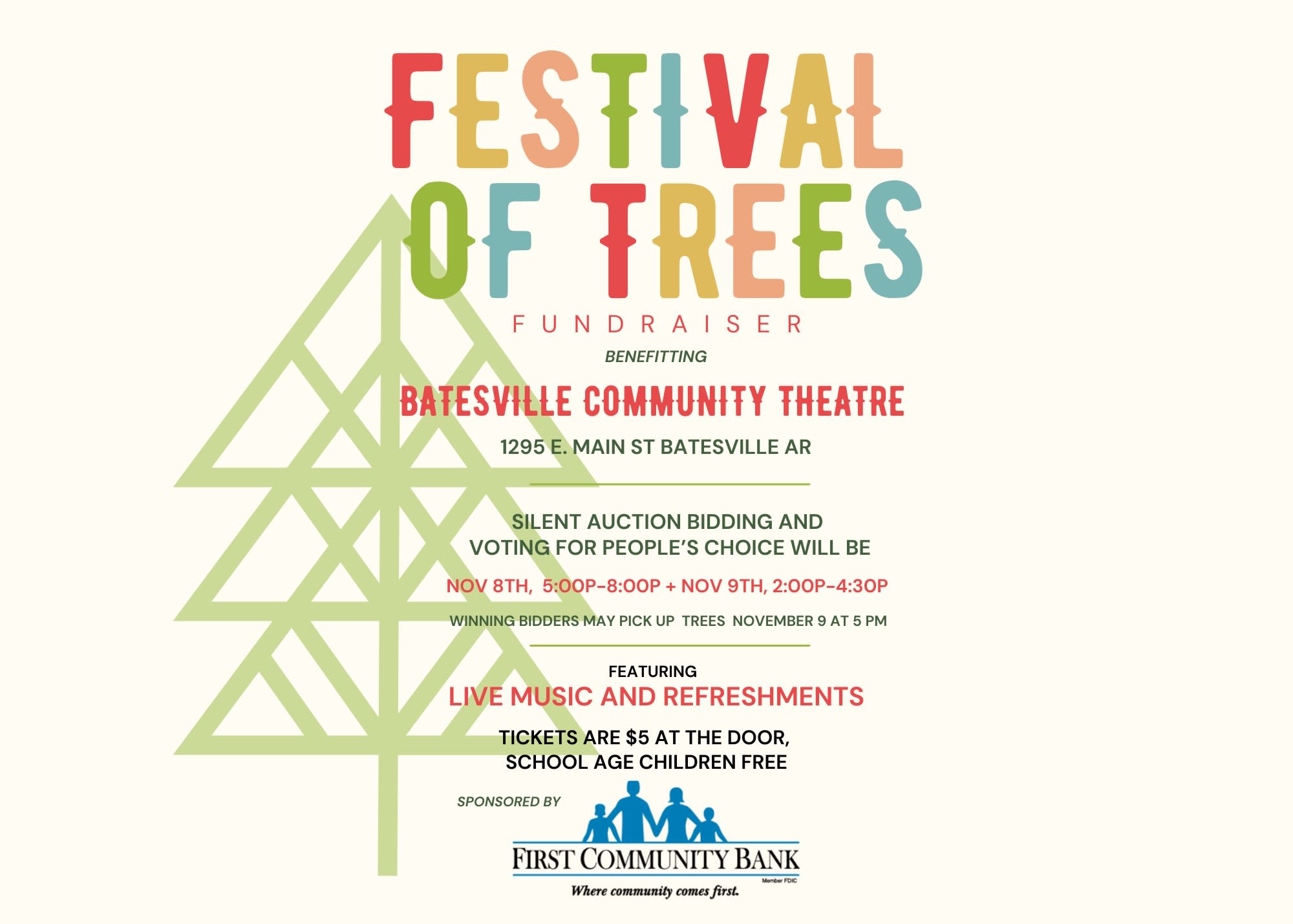 Get in the Holiday Spirit with BCT’s Festival of Trees! If you or your business would like to provide a tree for the silent auction or if you have questions, email us at bctarkansas@gmail.com or message on Batesville Community Theatre Facebook or Instagram page.