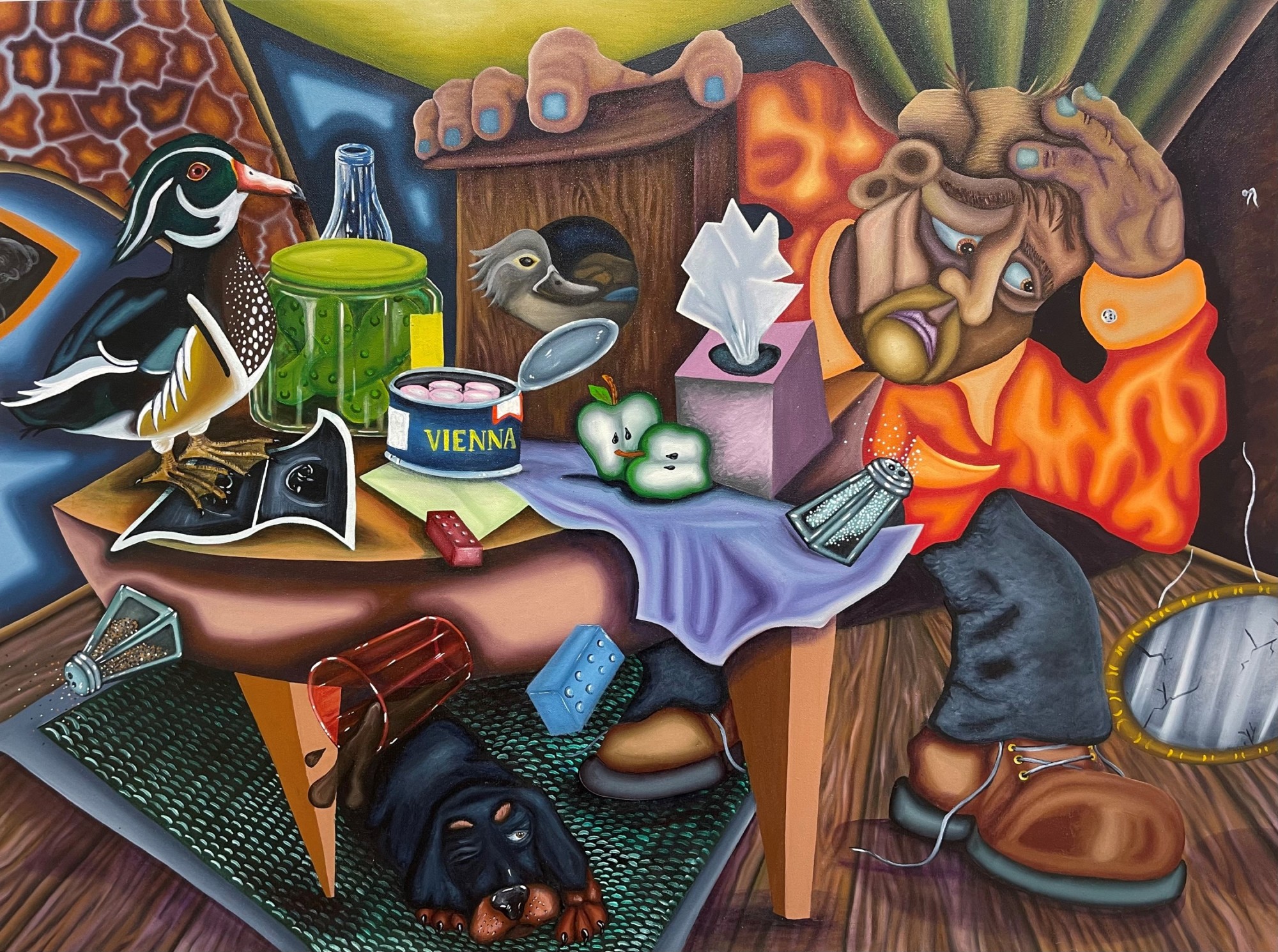 In “Fleeting Time,” Riner recreates the vanitas genre – a genre that flourished in the Netherlands in the late 16th and early 17th centuries as a metaphor for the meaninglessness of earthly life and transient nature of earthly goods and pursuits. Translated from the Latin word meaning vanity, hallmarks of this artistic genre include depicting symbols associated with death and the futility of earthly pleasures. Employing classical iconography, such as skulls, timepieces, fruit and flowers in contemporary fashion, Riner comments on 21st century vanitas to allude to the transient and cyclical nature of life, death and rebirth.