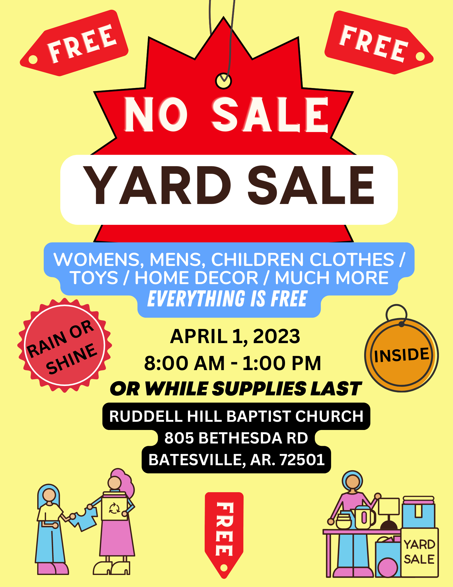 No Sale Yard Sale "Everything is Free" Ruddell Hill Baptist Church is having a “No Sale Yard Sale.” Everything is FREE. Yes. We said FREE! We will have women’s, men’s, and children’s clothes, home décor, toys, and much more. Rain or shine. April 1st, 2023. While Supplies Last. 8 a.m. to 1 p.m. We are praying that we will be a blessing to our community.