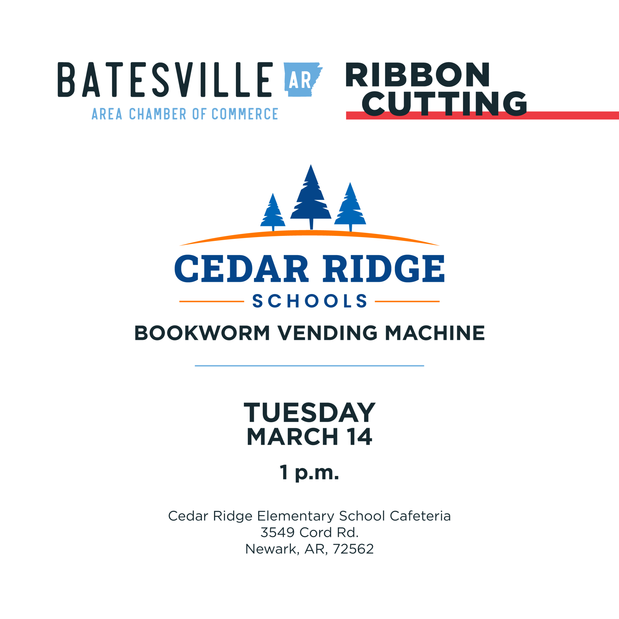 The Batesville Area Chamber of Commerce (BACC) will hold a Ribbon-Cutting ceremony for Cedar Ridge Elementary School's new book vending machine. The ceremony will occur in the school's cafeteria at 3549 Cord Road in Newark on Tuesday, March 14, at 1 p.m.