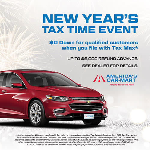 It’s tax season. Are you looking for a new vehicle? America’s Car-Mart can help! Take advantage of this great offer and keep your money working for you. Visit your local Car-Mart or get started on-line today. Learn more at https://www.car-mart.com/new-years-tax-time-event/