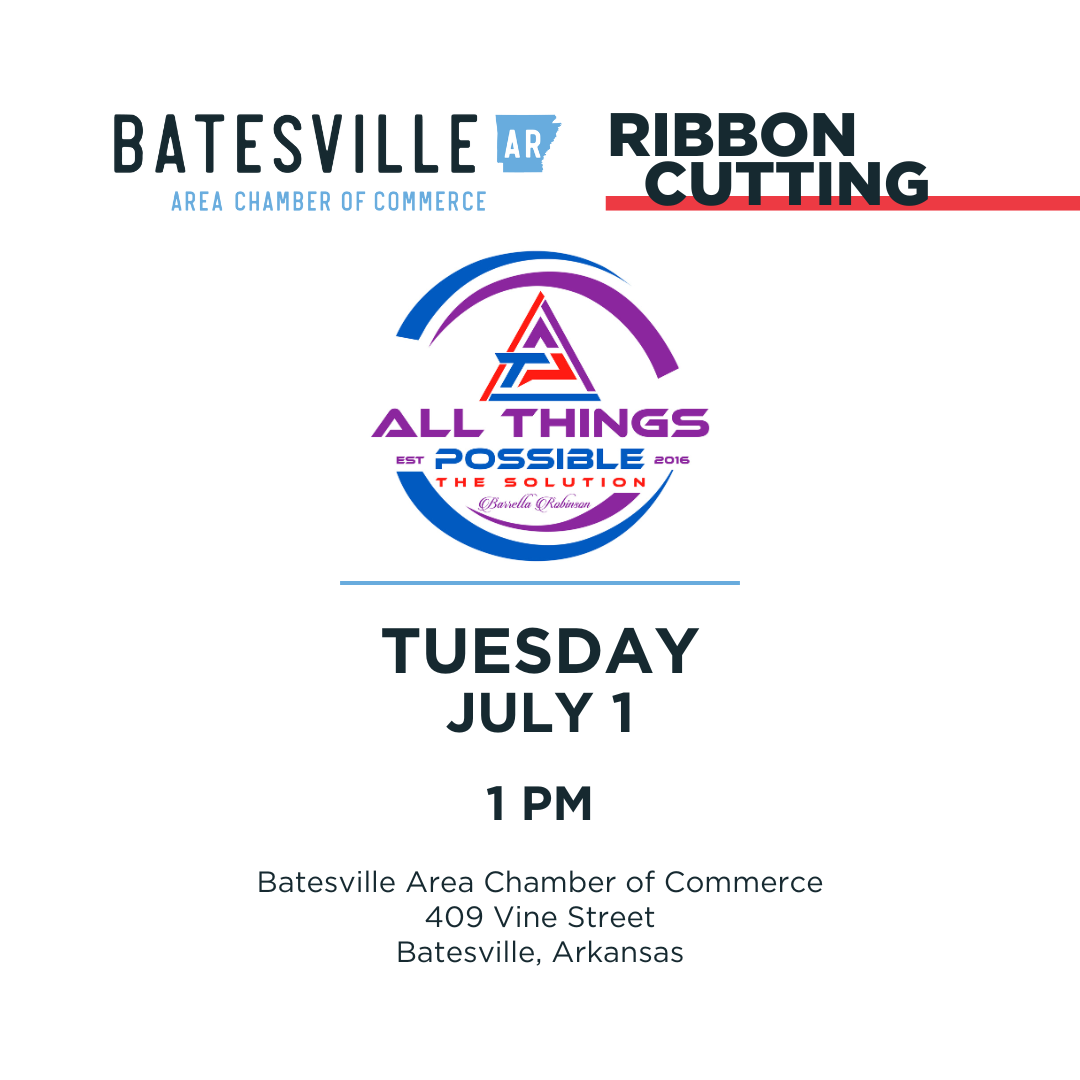The Batesville Area Chamber of Commerce will host a ribbon-cutting ceremony for All Things Possible (ATP) Business Services on July 1 at 1pm. The ceremony will take place at the Chamber’s offices located at 409 Vine Street in Batesville.