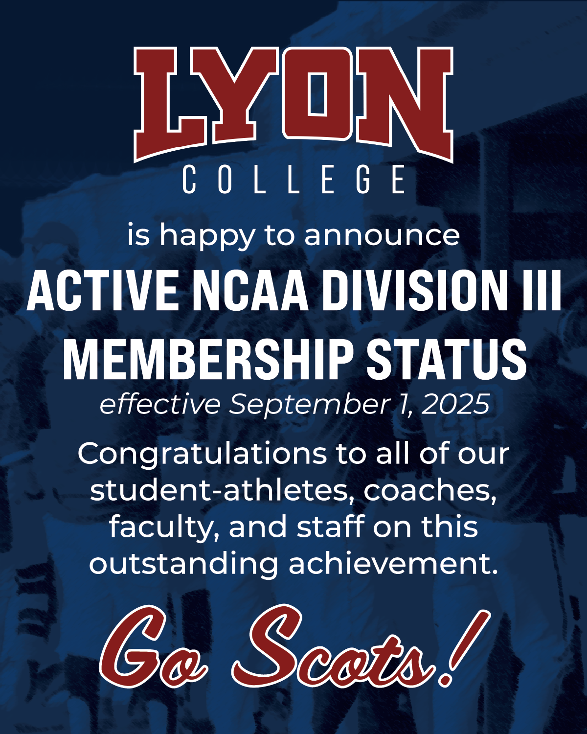 “This is a major milestone for Lyon College and a moment of pride for our entire campus community,” said Lyon College President Dr. Melissa Taverner. “Active NCAA Division III membership affirms our deep commitment to student-athlete development, academic excellence and ethical competition. I could not be prouder of our athletics staff and the many students, faculty and staff members, and fans who supported this journey.”