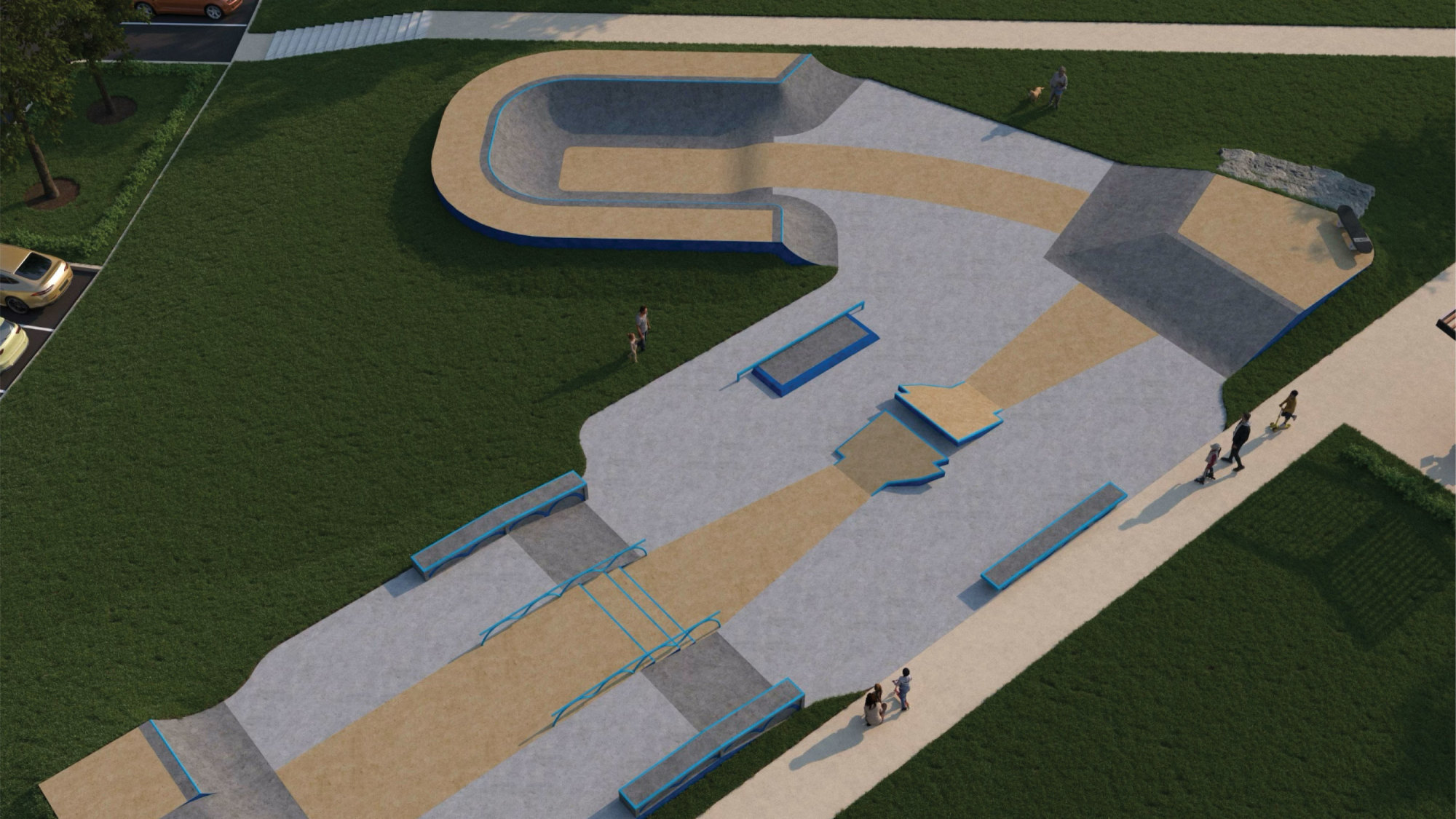 - Sports Courts: Near the park entrance, a new court sports complex will include fully-lit courts for pickleball, tennis, and other court-based recreation. These spaces will foster friendly competition and promote physical fitness. Seating areas and adjacent restrooms will make it easier for spectators and participants to enjoy extended time at the park.