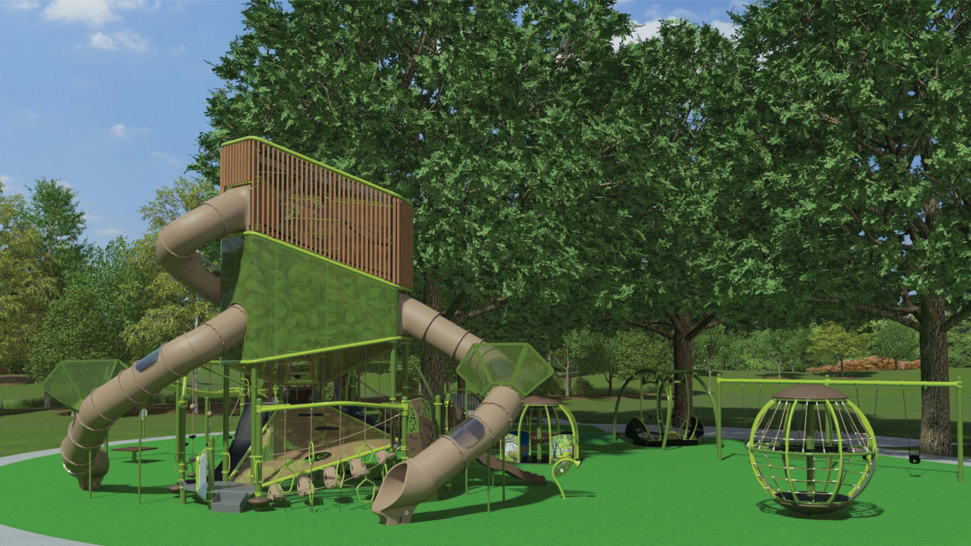 - Inclusive Play: The new playground at Riverside Park is designed to serve children of all ages and abilities, ensuring universal accessibility. Unlike traditional playgrounds, it will feature a sensory-rich, nature-inspired environment that encourages creativity, imagination, and social connection. Thoughtful grading, materials, and equipment selection ensure that all children can play together in the same space, including those with mobility, sensory, or cognitive challenges.