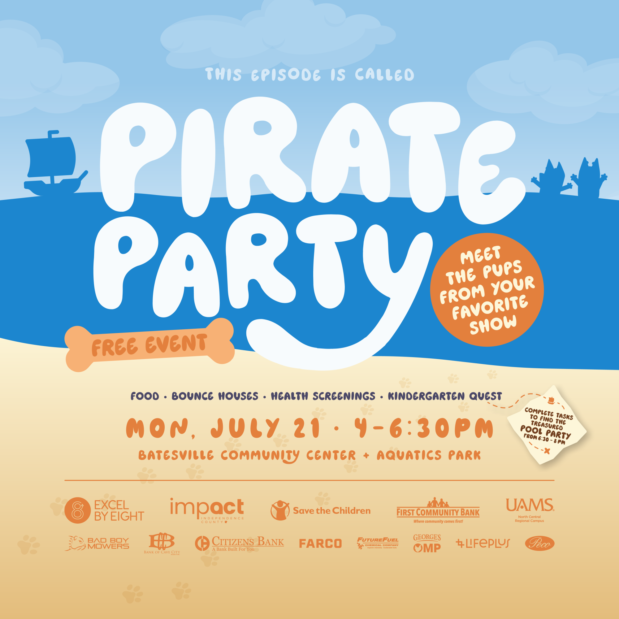 🍕 Free Food 🎈 Bounce Houses 🩺 Health Screenings 🧭 Complete the Quest to earn a map to the Treasured Private Pool Party (6:30–8 PM)! 🐾 And don’t miss surprise visits from a few familiar animated pups!
