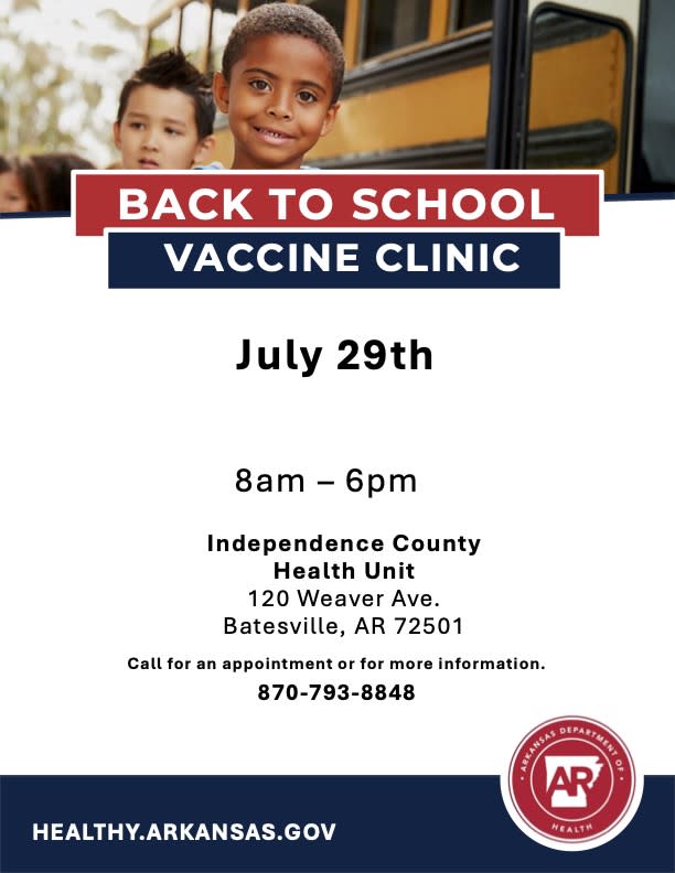 On Tuesday, July 29th, the Independence County Health Unit of the Arkansas Department of Health (ADH) will offer back to school vaccinations at no charge; their clinic is located at 120 Weaver Ave. Batesville AR 72501. The event will be from 8 AM to 6 PM. People should bring their insurance cards with them to the vaccine clinic. If they do not have insurance, or the insurance does not cover shots, vaccine will still be available at no charge.
