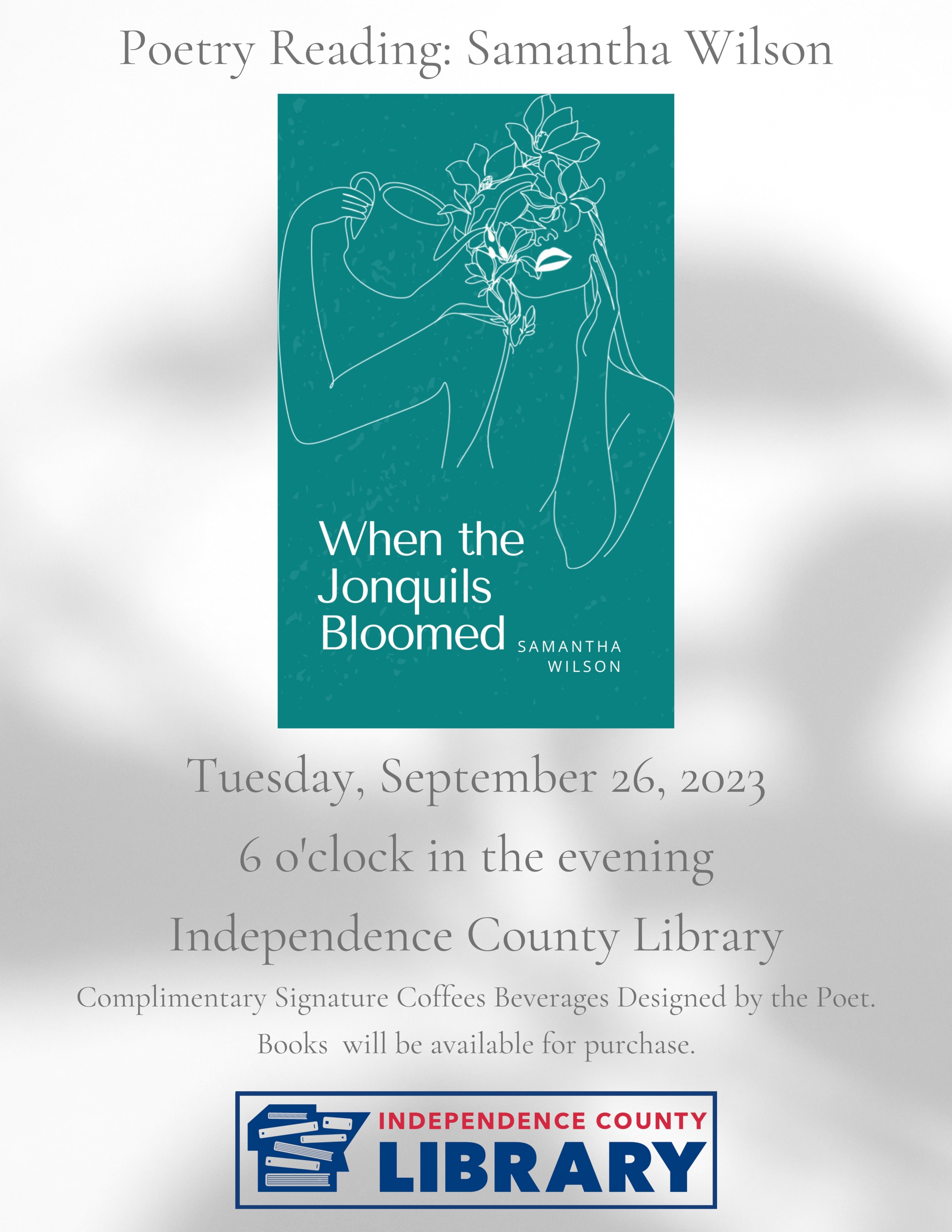 Celebrate home-grown talent with a poetry reading by published local author Samantha Wilson. Signed copies of Wilson's books will be available for purchase. Complimentary coffee beverages created by the poet will be served.