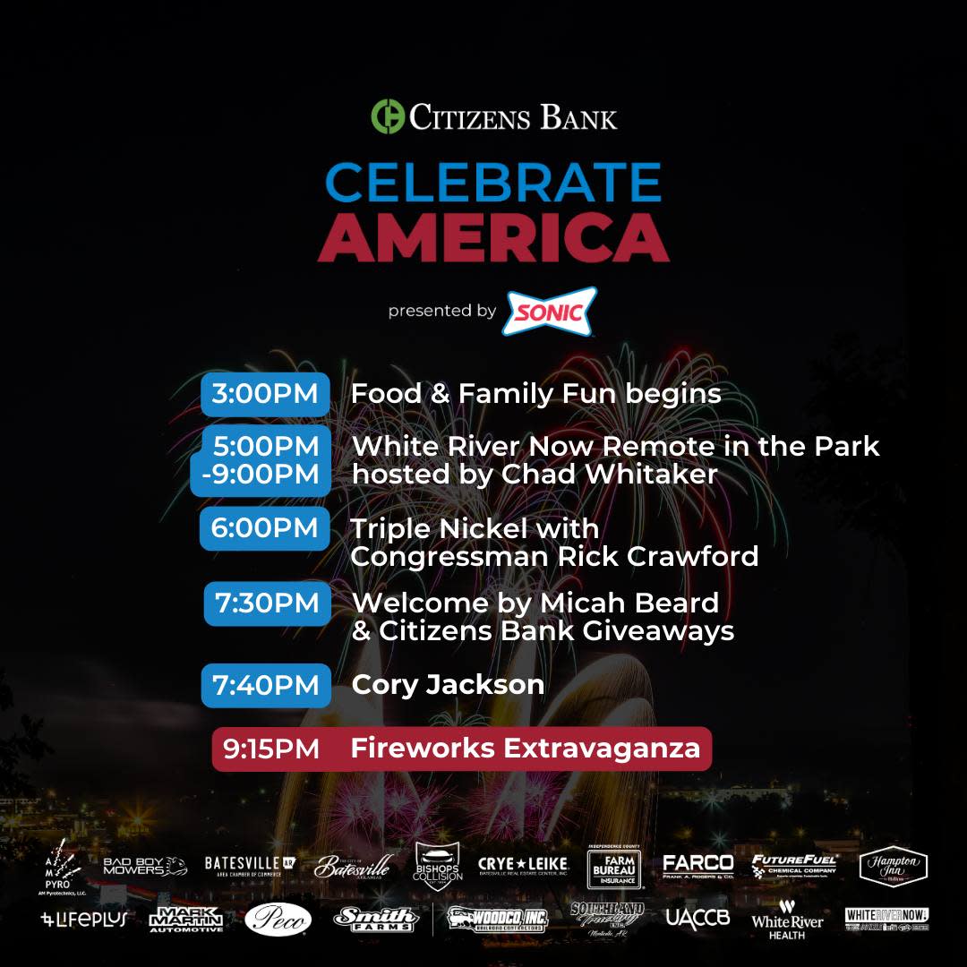 Presented by Sonic, the infamous Citizens Bank Celebrate America fireworks show will take place at Riverside Park in Batesville on Thursday, July 4th.