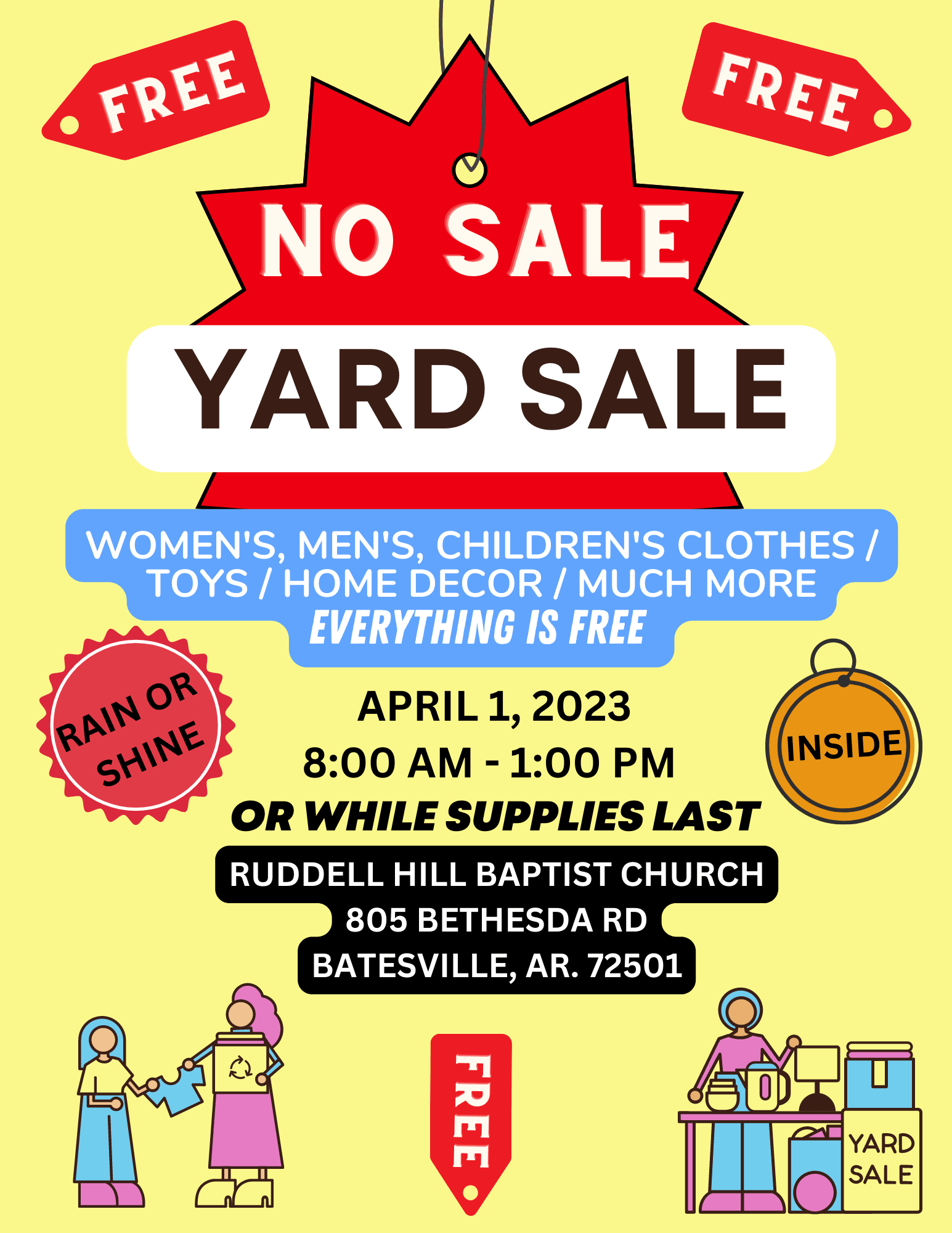 Ruddell Hill Baptist Church is having a free “No Sale Yard Sale & Block Party”. Everything is free. Yes. We said Free. We will have women’s, men’s, and children’s clothes, home décor, toys, and much more. Rain or shine. April 1st, 2023. While Supplies Last. 8:00 am to 1:00 pm. We are praying that we will be a blessing to our community.