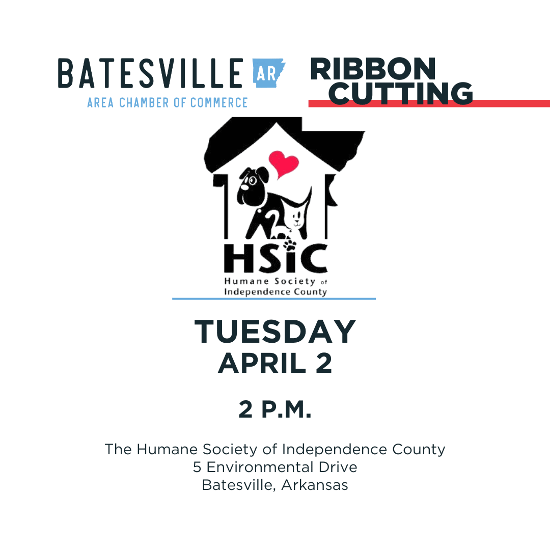 The Batesville Area Chamber of Commerce will hold a Ribbon-Cutting ceremony for The Humane Society of Independence County (HSIC). The Ribbon-Cutting will occur at 5 Environmental Drive in Batesville on Tuesday, April 2, at 2 p.m.