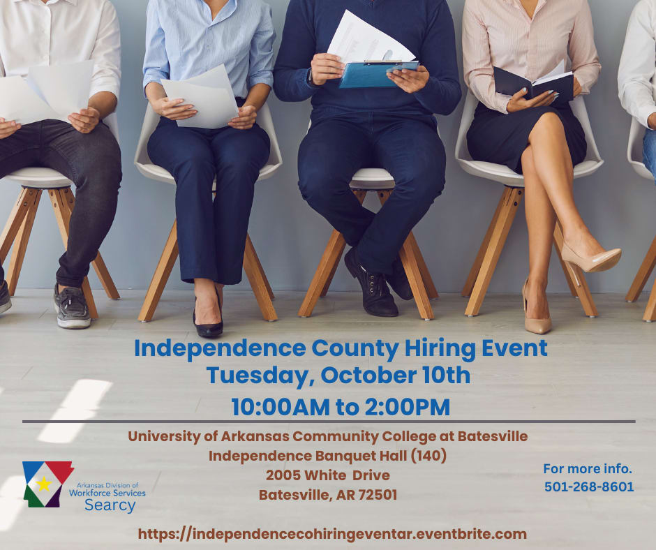 Join us for the Independence County Hiring Event. Division of Workforce Services staff and mobile unit will be on-site to assist you with resume writing and online applications. There will be great networking and job opportunities. Come dressed for success! Employers can register for the event online or by calling 501-268-8601 for more information.Images