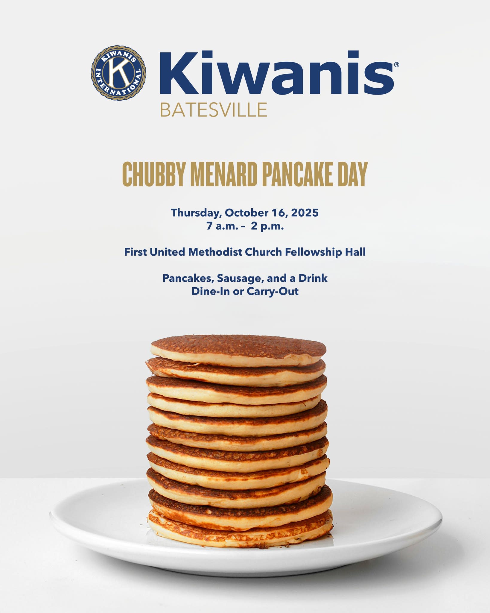 🥞✨ A Batesville tradition since 1972! Join us for Chubby Menard Pancake Day hosted by Kiwanis Batesville AR. 📅 Thursday, October 16 ⏰ 7 AM – 2 PM 📍 First United Methodist Church Fellowship Hall 🎟️ Tickets are only $6 and include pancakes, sausage, and a drink. Dine-in or carry-out!Images