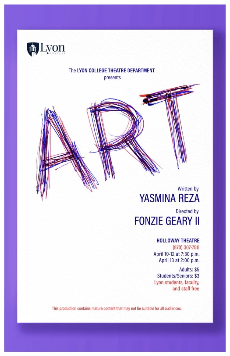 Lyon College Theatre will present Yasmina Reza’s acclaimed comedy 'Art' on Thursday through Saturday, April 10-12, at 7:30 p.m. and on Sunday, April 13, at 2 p.m. in the Holloway Theatre on the Lyon College campus, 2300 Highland Rd., Batesville.