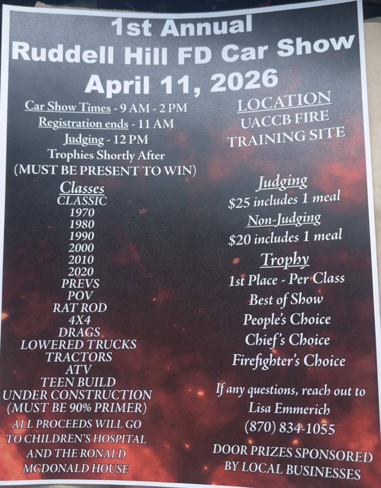 Ruddell Hill Fire Department is sponsoring a car show on April 11th. All proceeds go to Arkansas Children’s Hospital and The Ronald McDonald House. See flyer for more information.Images