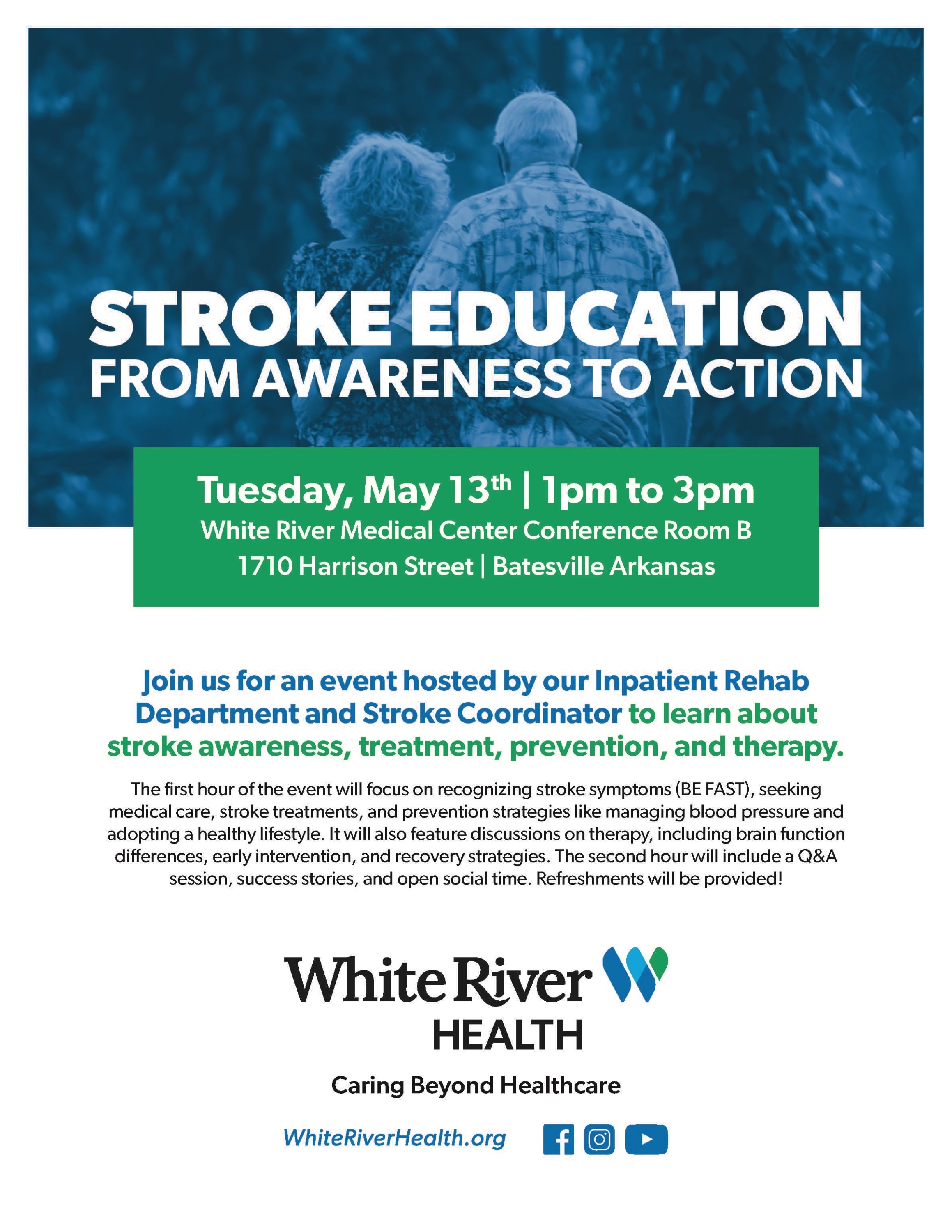 Join White River Health for an event hosted by the Inpatient Rehab Department and Stroke Coordinator to learn about stroke awareness, treatment, prevention, and therapy. The first hour of the event will focus on recognizing stroke symptoms (BE FAST), seeking medical care, stroke treatments, and prevention strategies like managing blood pressure and adopting a healthy lifestyle. It will also feature discussions on therapy, including brain function differences, early intervention, and recovery strategies. The second hour will include a Q&A session, success stories, and open social time.